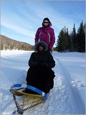 Ca c’est le cri du chien qui a hâte de partir en balade ! Ben oui, il est prêt depuis un moment, équipé de son harnais et attaché au câble qui le reliera au traineau, avec ses 40 copains qui profiteront eux aussi de la belle balade en forêt et sur le lac. Ok, il faut travailler et tirer les deux humains derrière, mais à six ont fait largement le poids et pour peu on s’envolerait même.
